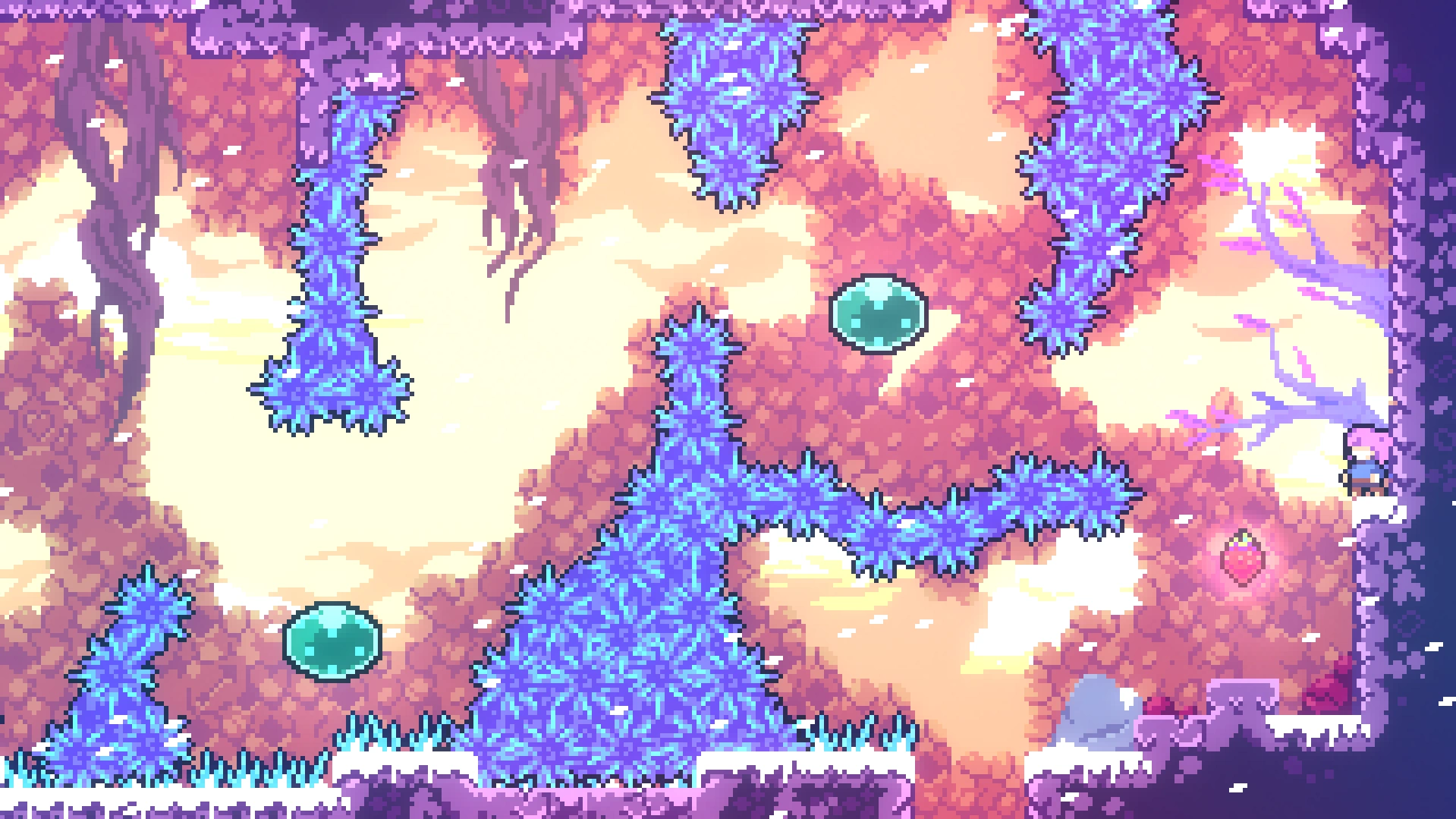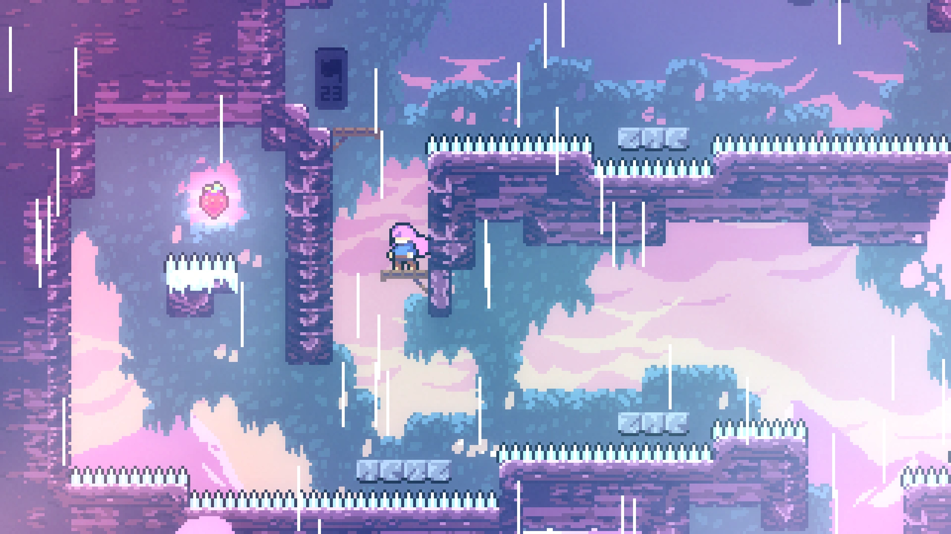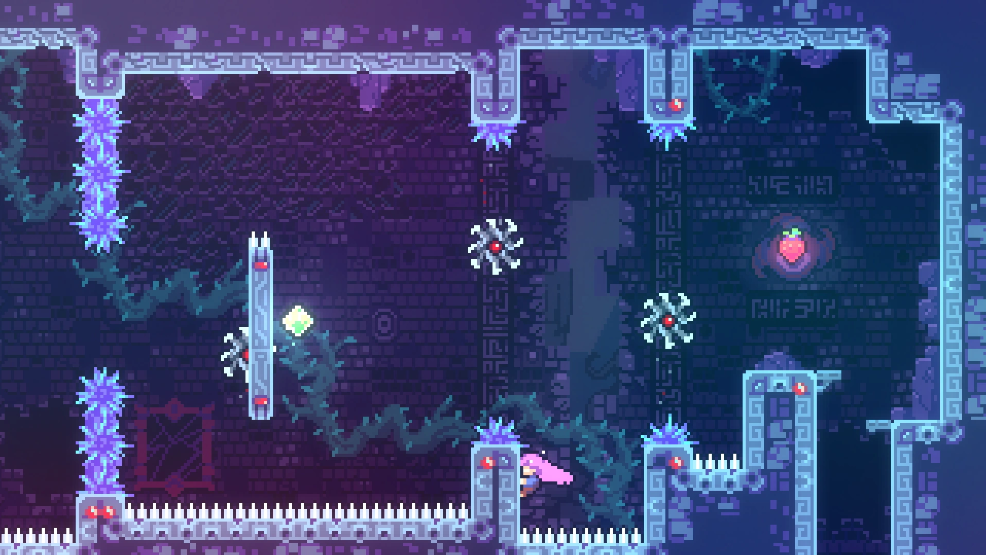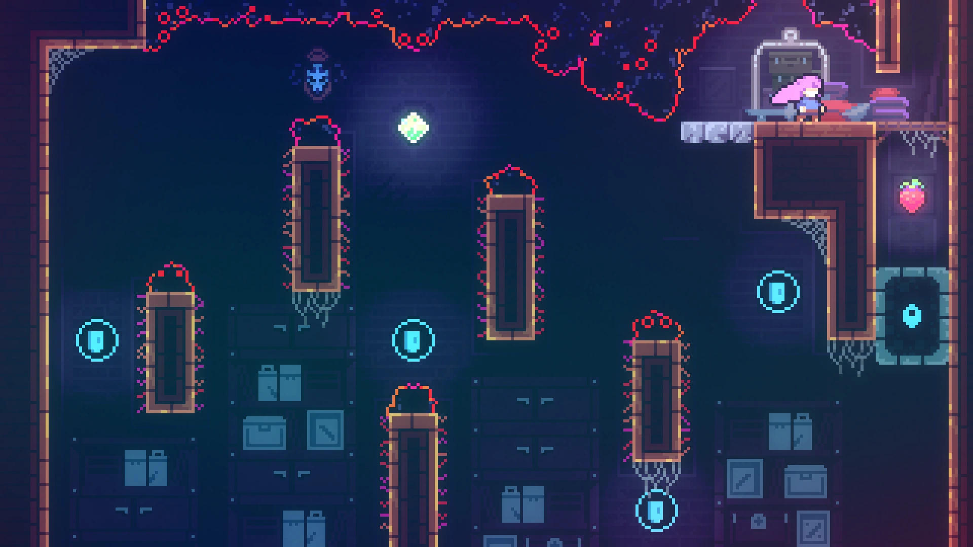 Чтобы добраться до прохода в нужную комнату, требуется применять восстановление рывка при переходе в другой экран, используя левую комнату. Забравшись наверх, игроку нужно обойти препятствия и забрать ягоду.