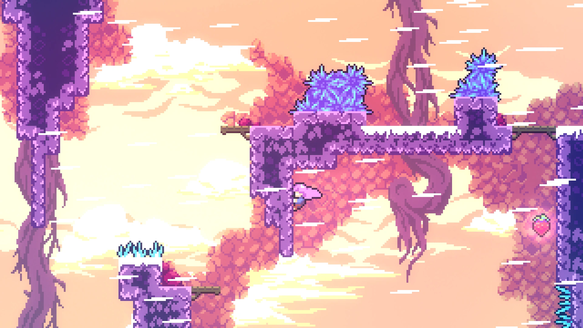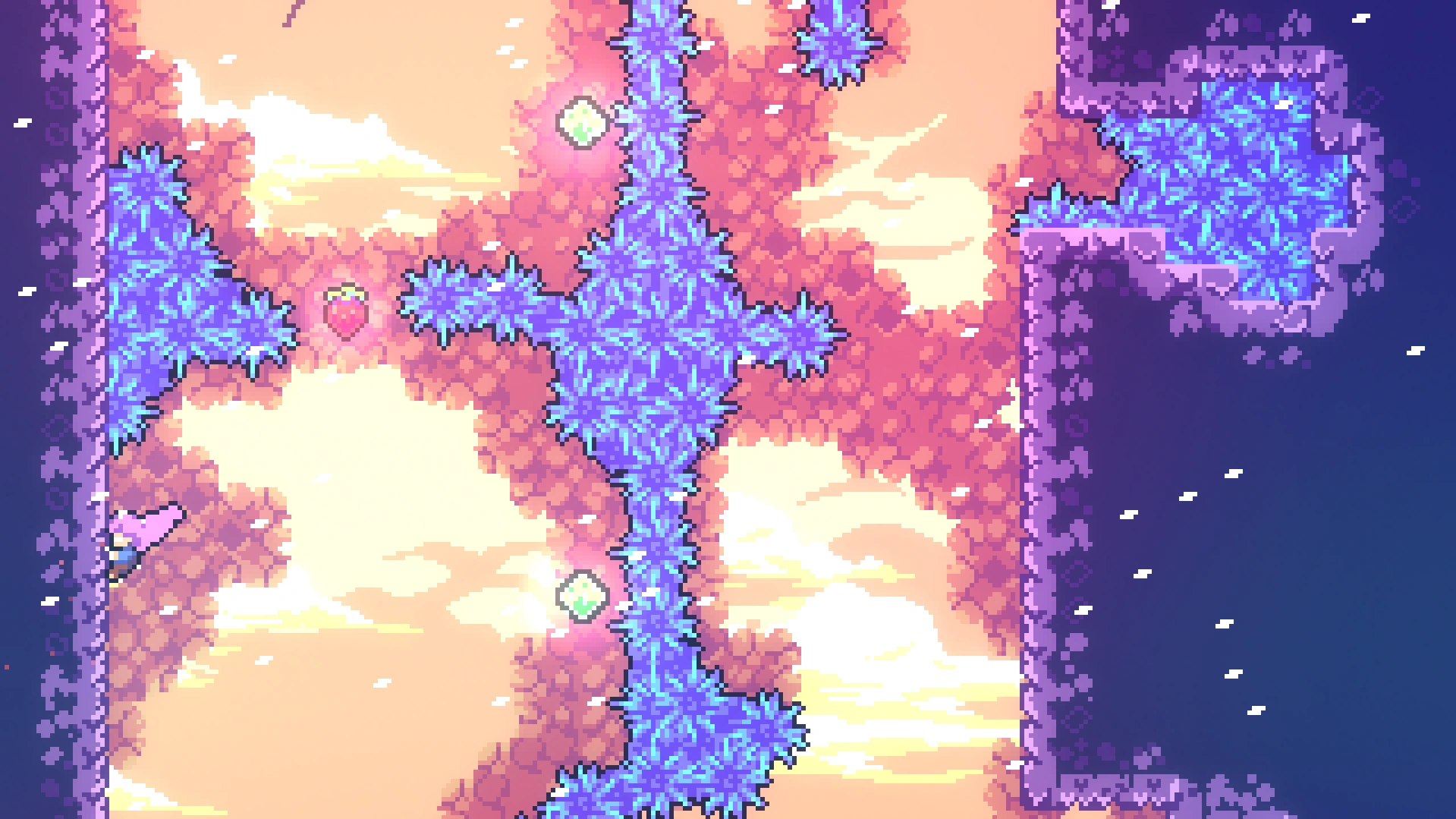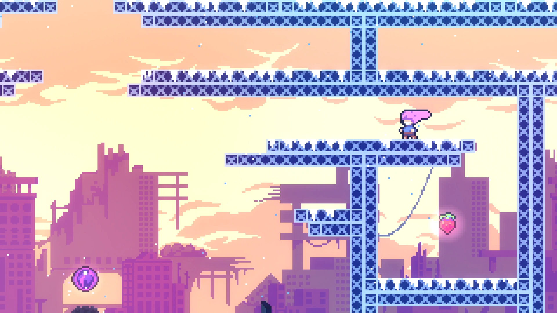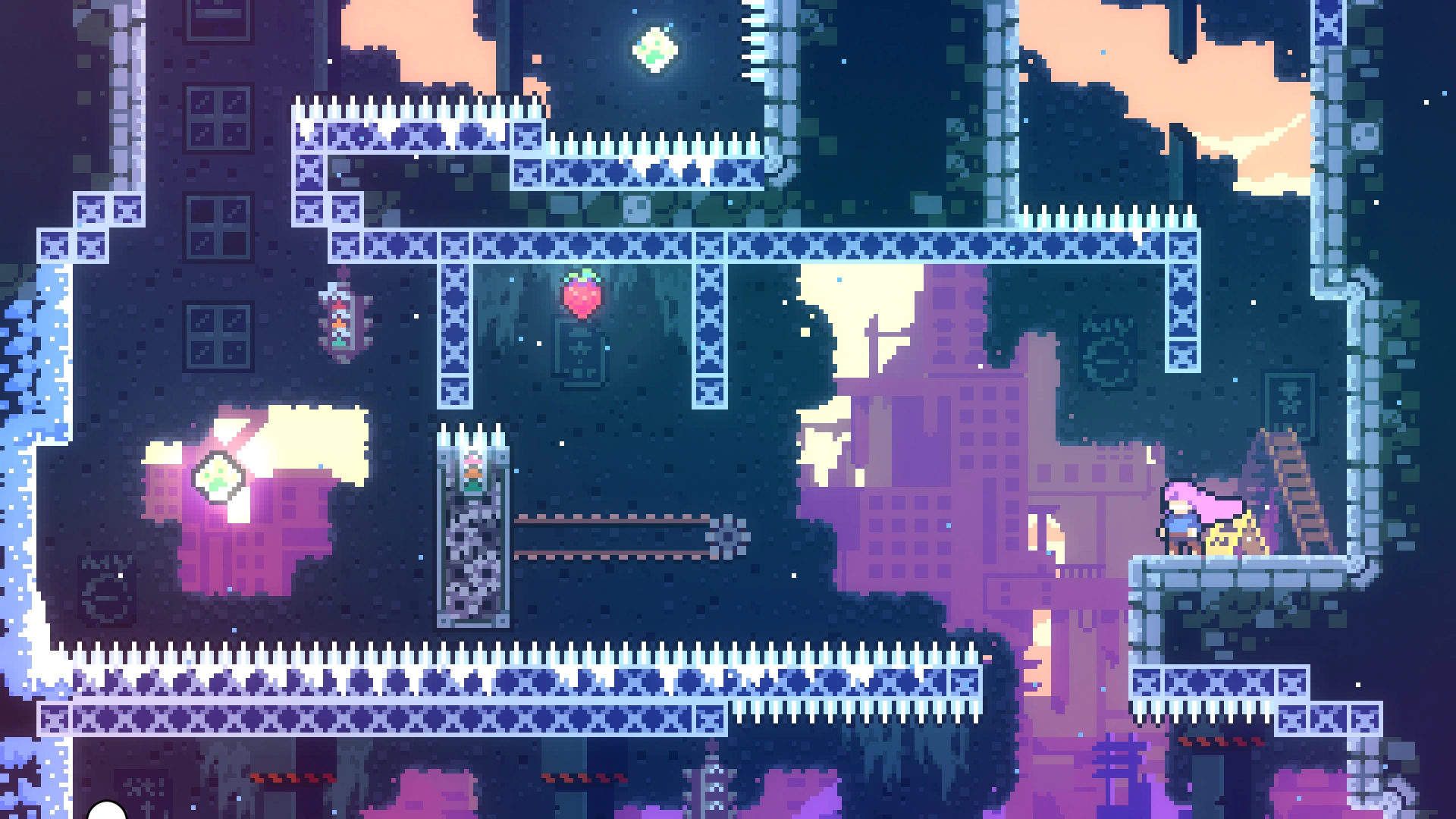 В длинной комнате с движущимися дрим-блоками нужно выбрать самый правый проход. Игрок попадёт в горизонтальную комнату, вверху которой находится ягода. Нужно забрать её и вернуться назад.