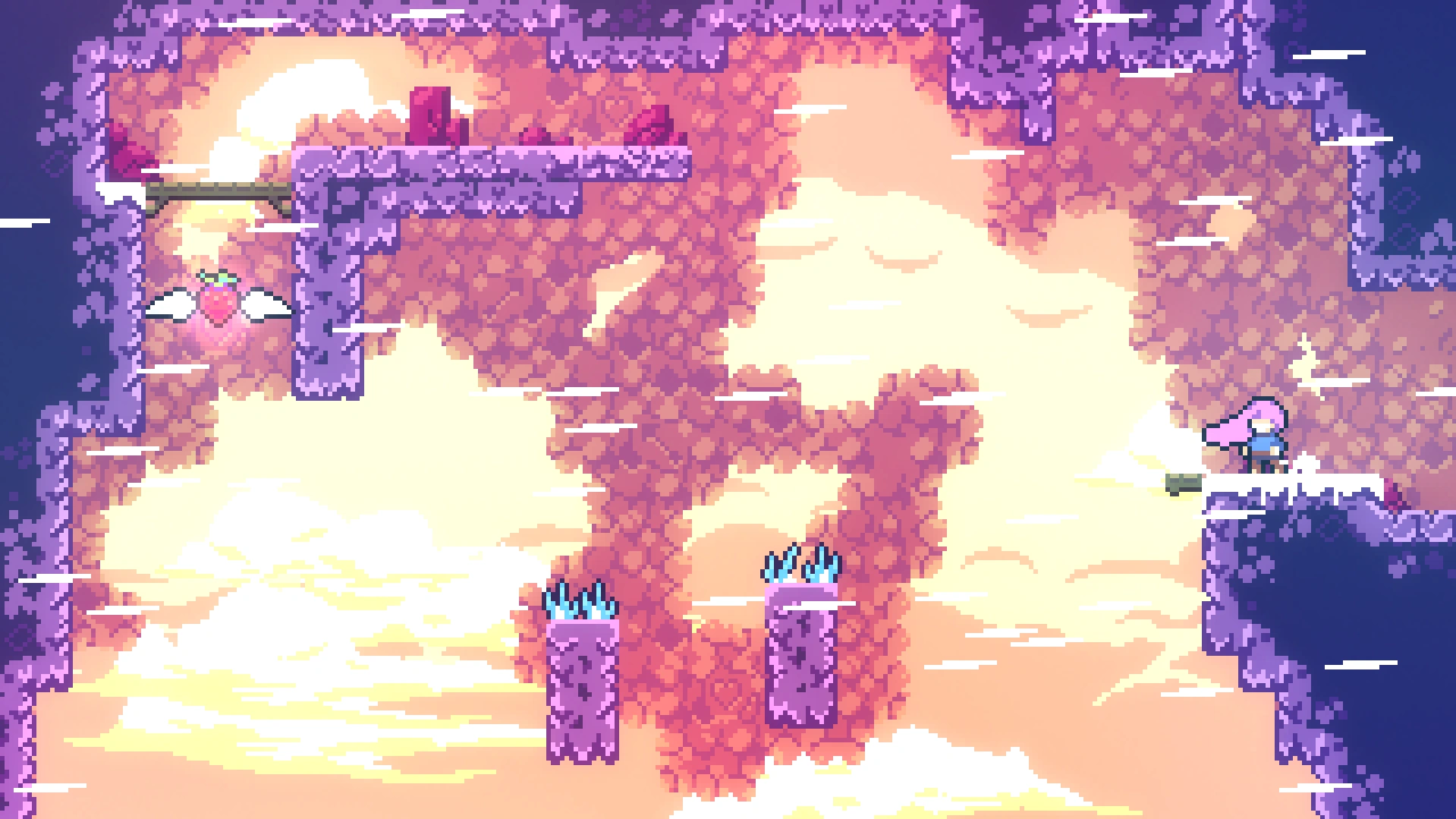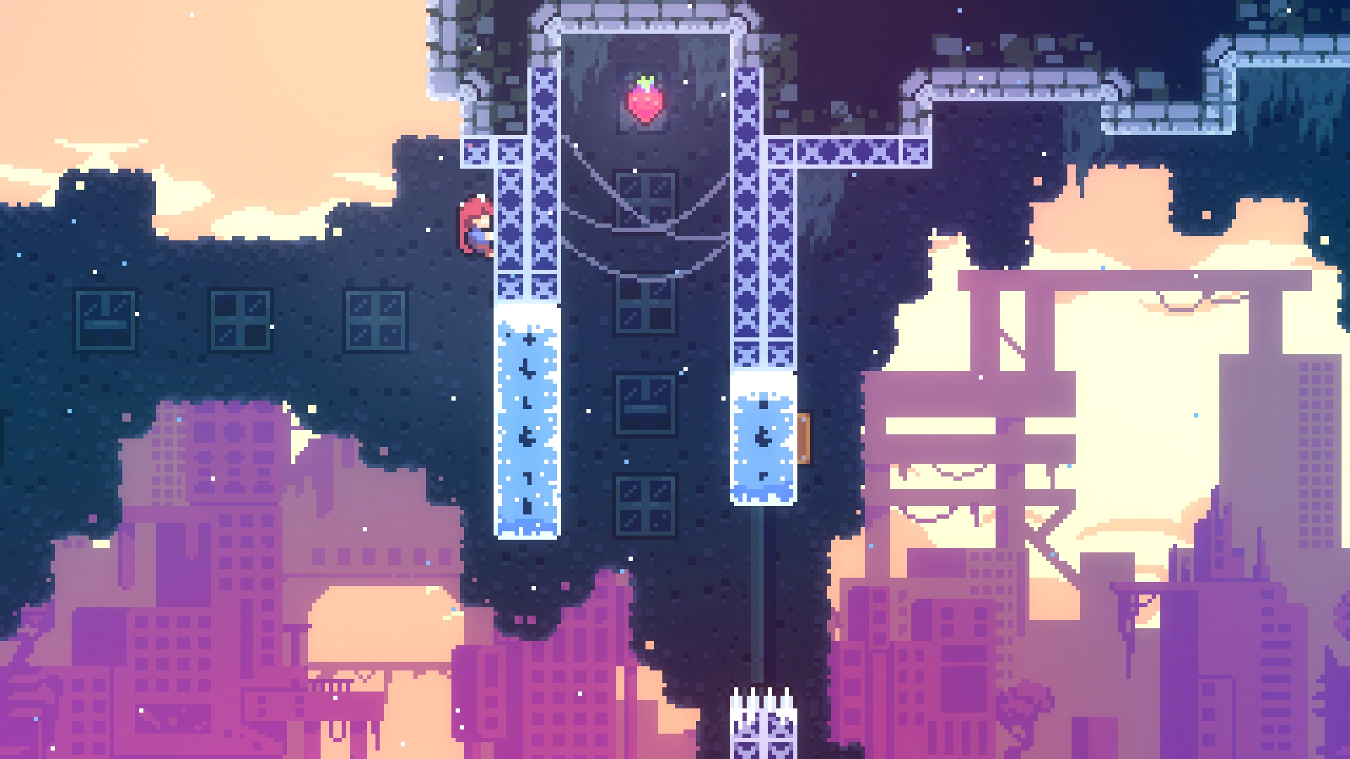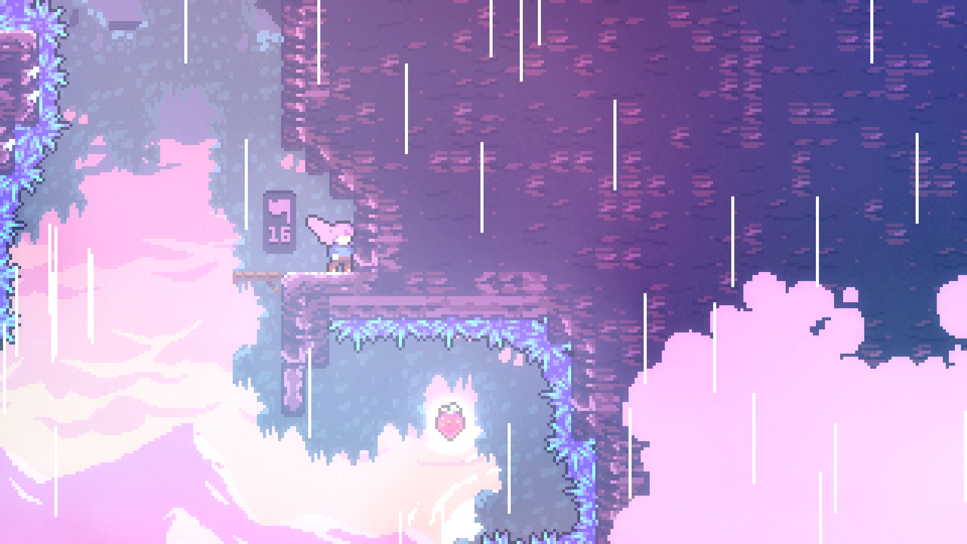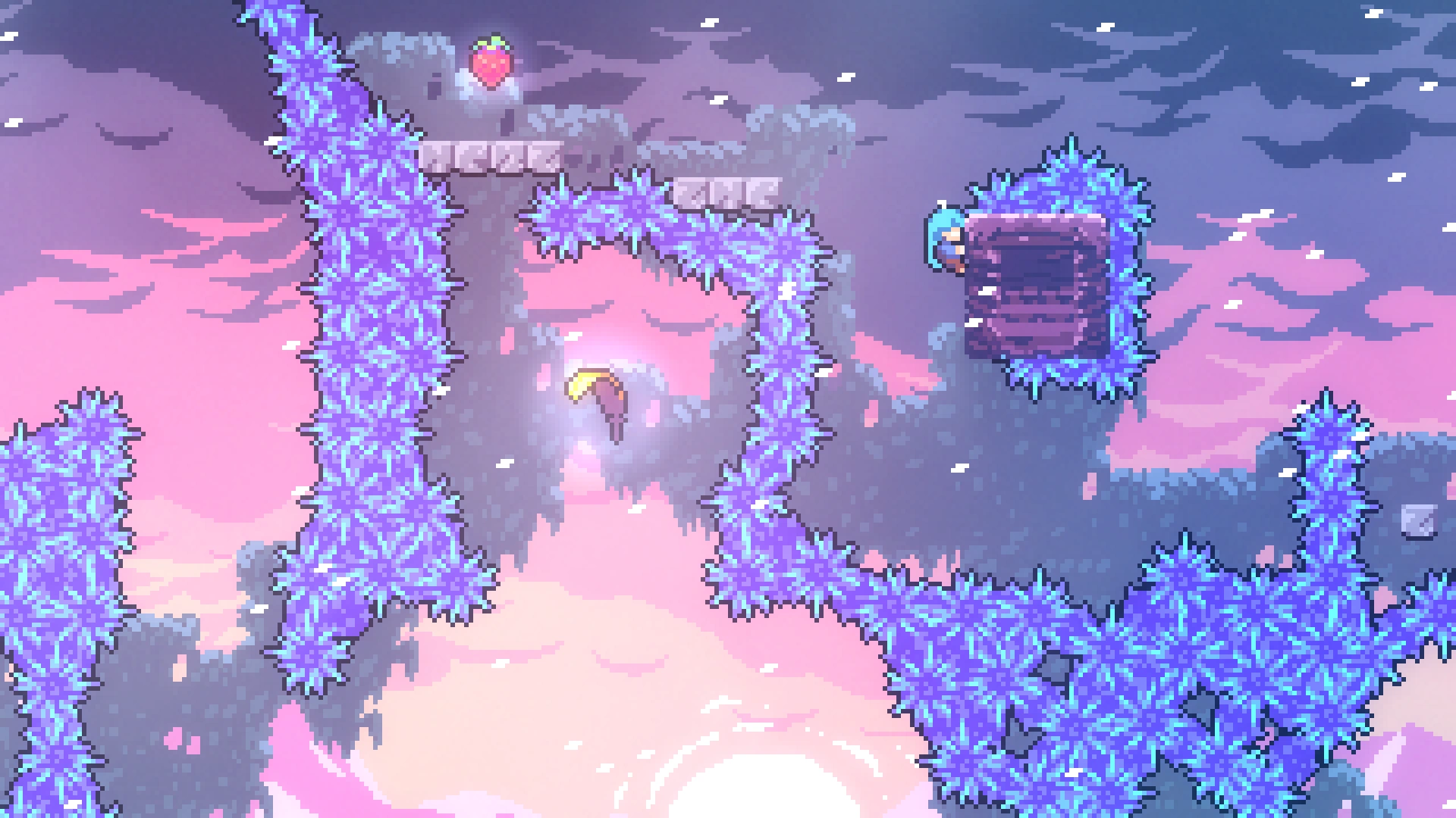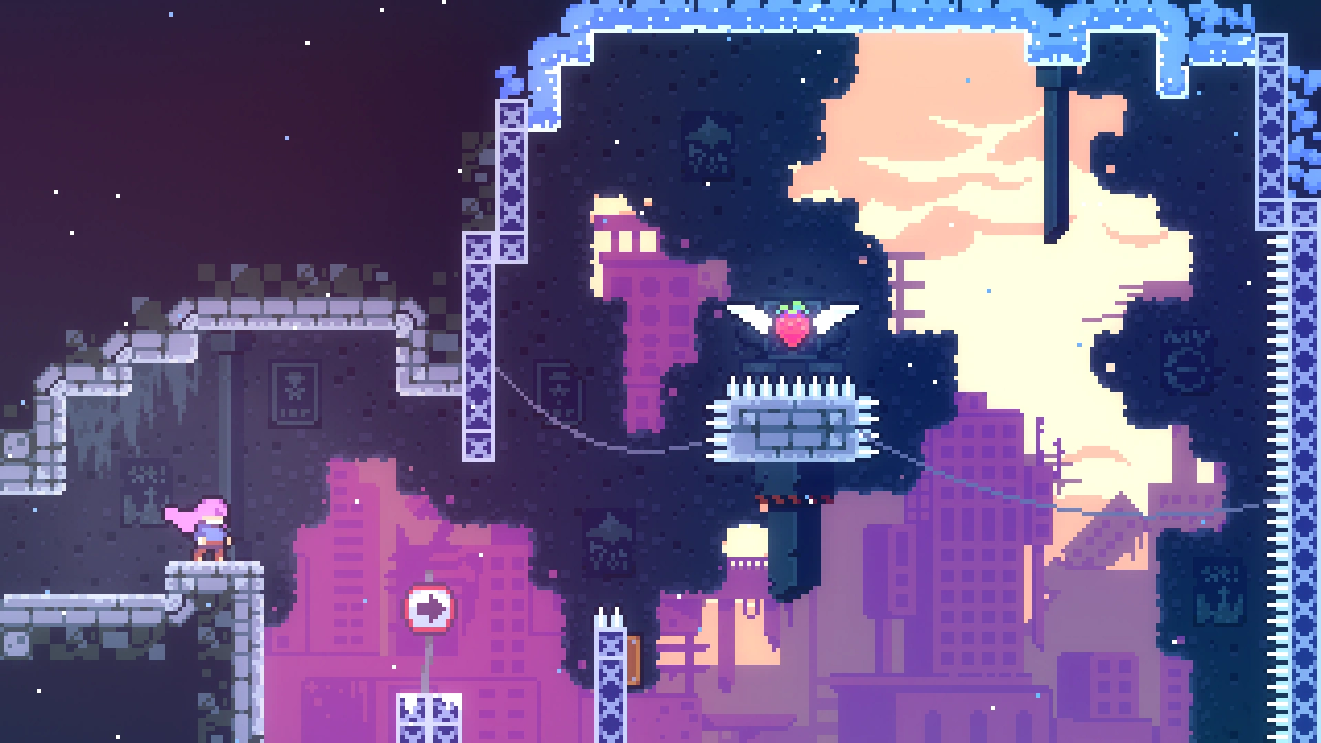 В длинной комнате с движущимися дрим-блоками нужно выбрать самый правый проход. Игрок попадёт в горизонтальную комнату, вверху которой находится ягода. Нужно забрать её и вернуться назад.