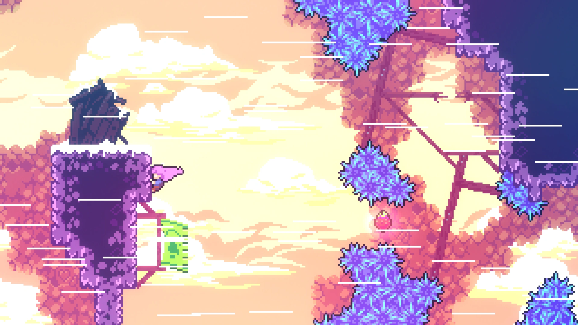 В одной из комнат есть узкий проход наверх, который изначально не виден. Далее игрок попадёт в комнату с летающей ягодой. Первую часть комнаты можно пройти без рывков, но во второй его придётся сделать. Так как ягода активировалась, то до места справа надо быстро долететь и поймать её в полёте.