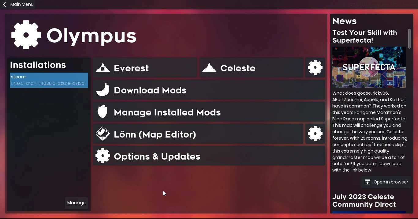 Лаунчер позволяет установить альтернативный клиент Celeste Everest, редактор уровней и сами моды. В правой части интерфейса располагается блок с новостями о моддинге игры. Для установки модового клиента требуется нажать Install Everest, после чего выбрать исполняемый файл Celeste в директории игры и нужную версию Everest. По завершении установки лаунчер позволит запустить как оригинальный, так и альтернативный клиент игры.