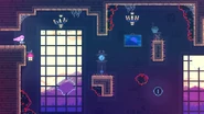 Dust bunnies and sludge variants will make up most of the challenges in this subchapter, with careful stalling inbetween moving sludges using both mid-air dashes being a key strategy. This will be a difficulty spike from the previous subchapters as many rooms can be very hard without good knowledge of the proper timing windows to get through them. In the fourth room of the subchapter, a single key token floats within 4 moving sludges in a rhombus formation. Wait at the left ledge, watching for when a moving sludge goes from the bottom diagonally to the left. Right when this moving sludge goes back to the bottom, jump forward and dash diagonally behind it into the key token, then keep moving right nudging yourself forward ever so slightly through the other moving sludges. In the room right after it, the middle section should be done with only straight right dashes to consistently graze over the dust bunnies. The rest of that room and the two after it will just be getting good timings past moving sludges and/or circling sludges, so watch until you see the right time to fall down and dash forward. The ninth room of the subchapter is a large pool of dust bunnies with a spring attached to a platform above and a moving sludge on the right. Wait for this moving sludge to be on either side (aka, when it isn't currently moving) to dash straight up into the spring and hold no inputs, then dash diagonally up-right to safely fall into the gap.