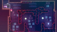 In the tenth room of the subchapter, there's a small gap seen in the ceiling which can be entered. The room entered from there will have a Winged Strawberry boxed in the bottom-right corner with no feasible way to touch it. Above it is also a heap of dust bunnies. This berry will need to be collected as it's flying away. Jump to the spring at the left side and wait until you can pass the moving sludge and hit the next spring to be bounced to the right. Grab the wall you arrive at and wait until the other moving sludge is moving down to jump into the spring above and grab the platform the moving sludge is guarding. Quickly jump over it to the next wall, and again to the next wall on the left which you'll need to dash up into in order to hit the spring. After hitting the spring, you need to quickly dash over to the open area in the top-right to collect the Winged Strawberry before it flies away.