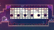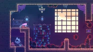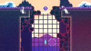 This room is a single vertical corridor with moving sludges on diagonal paths and springs all over. The timings can seem overwhelmingly inconsistent at first, but there is always a guaranteed way to do it. Jump to the right when the first moving sludge goes to the top, then dash diagonally up-left into the spring as soon as it starts going down. Dash up-right two times into the next spring, then up-left two times to hit another spring. Let the moving sludge above pass to the right before doing two up-left dashes into yet another spring. Again, let the moving sludge above pass and go to the left before dashing up-left two times to bounce off another spring. Quickly dash up-right, then shortly after dash up-right again into the spring to the right to allow for the moving sludge to move behind you and allow you to be bounced left. Dash straight up, then the moving sludge to the left will move out of the way and allow you to dash up-left into the spring and be bounced back to the center of the room, just below the purple orb. Dash straight up twice to reach the purple orb and be taken to the next subchapter.