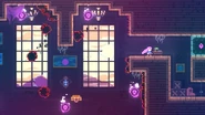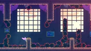This will be a room where cycles are crucial to know and stalling in the air is very important for corrections. Jump off the ledge to the right and dash straight right, then straight up to the right of the spring, then fall to underneath the spring and grab the wall. Climb up to just below the spring and watch the set of two moving sludges to the right. Climb up into the spring when both moving sludges reach the edge to safely be bounced to the next section of the room. Depending on your cycle, many situations could arise from here, but generally your next actions should be aiming for the spring on the left to get a key token, then aim to land on the moving platform with a spring, stalling with a straight up dash if needed. Note that dashing straight up into the ceiling above can be helpful for manipulating your timing as opposed to in the open area to the left and right. For the key token below, stall for a bit until you see an opportunity where the moving platform and moving sludge are both at opposing sides, at which point you should fall into the key token and dash straight up once or twice to escape, then landing back on the spring. Bounce on the spring on the left side then dash straight up and grab the wall, waiting for the circling sludge to move to the lower half of its path to jump to the left for another key token, then hit the spring to the lower left again to reach the moving platform again. Watch the moving sludge to the upper right for when it's away from the wall to dash straight up and climb up above its path, then wait for it to move away from the right to jump into the key token and land on the spring below with a dash in whatever direction is needed. After bouncing on the moving spring and going right, dash straight right into the last key token, then jump to the left and dash straight up and you can reach the end corridor.