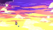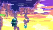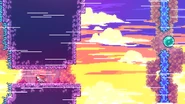 This room has some skull binoculars available to preview the room, if needed. Once you step past the starting ledge, wind will start blowing to the right at a very strong rate. Landing on pink clouds in this environment can be very tricky. Jump to the right and dash straight right fairly early to make it to the pink cloud as the wind appears. Bounce up while holding left a bit as to not be blown off of the pink cloud, then stop holding right after a bit after your bounce as you start to fall. Dash straight right to land on the next pink cloud but do it fairly far to the left so you don't overshoot it. Simple land on the pink cloud, then jump right immediately after and dash straight up, nudging left a bit such that the wind pushes you perfectly onto the next pink cloud, which you should do a large bounce off of followed by holding left for a bit to not be blown into crystal spikes on the right. After falling a bit, you can dash straight right into the corridor below for a brief safe spot. Run to the right and jump right, then dash up-right into a green bubble. Take this green bubble down-right and keep holding right. You'll arrive in another green bubble which should be aimed up-right, then dash straight up before being blown into crystals to the right and you'll make it to another green bubble. Aim this straight right and continue holding right, then dash up-right about at the point when you pass the blue flag in the background. You'll make it to a triggered platform which you need to simply grab and allow to move up. Hold right as soon as it's about to be destroyed to make it to one last green bubble, which you should aim up-right and then dash up-right shortly after popping out of it. You'll then reach a disappearing platform four units wide, then another one which is three units wide is to the right which you can just jump to carefully. Jump again to land on a two unit wide disappearing platform, then once more to a one unit wide disappearing platform, then jump all the way to the right to be able to dash diagonally up-right into the Crystal Heart to complete the level.