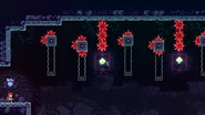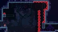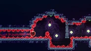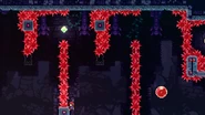 Pairs of swap blocks mostly covered in crystals hover in the air separated by crystals from the ceiling as your only means of getting to the right. The primary method of getting across is to jump to the right and dash straight up at where the right edge of the first swap block would be, then wall bounce to the right but not too far as to not touch the crystals. Fall down and quickly wall jump off the right side of the next swap block, collect the dash crystal, then ready another wall bounce off of the third swap block in the room. Do this wall bounce and repeat this process on the fifth swap block in the room, then after wall jumping to the right off of the last swap block you'll be able to climb to the end. Another method of doing this room is to start with a wavedash into then dashing straight up into the first dash crystal, then diagonally up-right. Do a wall jump to the right off of the third swap block to collect the next dash crystal and dash up-right again, then you can quickly wall jump off of the fifth and then sixth swap blocks' right sides to make it to the end barely. Note that this method forces you to pick up the Golden Strawberry if it has been unlocked and is considered harder if the player is adept at the usual method.
