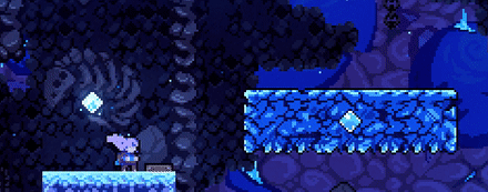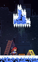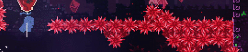 Spiky, brightly-colored crystals that protrude from walls or platforms. Like Spikes, they kill the player on touch and are usually found in rows. They can be found in different chapters in different colors, including azure and magenta. Crystals can be found in Chapter 4 (azure), Chapter 5 (red), Chapter 6 (magenta), Chapter 7 (magenta, azure, red, and violet), Chapter 8 (azure and red), and Chapter 9 (color shifting).