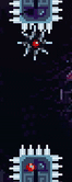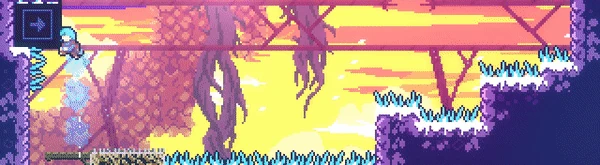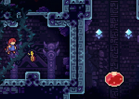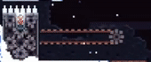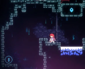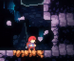 Dark purple platforms with an arrow pointing in a certain direction and one or two tabs (one located on top if the arrow points left or right, two—one located on the left side and one located on the right side—if the arrow points up or down). Upon being stepped on or hung onto, the Guided Platform will start moving in the direction that the arrow is pointing in; however, by standing on the tab (if on top) or holding onto the tab (if on one of the sides), the player can press an arrow key to move the platform in one of the two directions perpendicular to the one that the Guided Platform is moving in. For example, if the platform is moving upwards and the player hangs onto the tab on the left side and presses the left or right keys, the platform will move left or right, respectively. If a Guided Platform collides with another platform for more than a split second, the Guided Platform will disintegrate, reappearing in its original spot after a short period of time. Guided Platforms may also have Crystal Spikes on top of them. Guided Platforms can be found in Chapter 4, Chapter 7, and Chapter 9.
