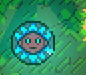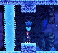 These are large blue jellyfish which can be grabbed to increase hangtime. Players can take hold of the jellyfish by pressing and holding the climb button. While holding, the up and down buttons can be used to fall more slowly or more quickly than default falling speed. By default, jellyfish are thrown whichever direction the player is facing when released. The down button can be held in order to release jellyfish in place. Normal movement, jumping, and wall jumping are all possible while holding a jellyfish, while they must be released in order for Madeline to dash. Several obstacles in Chapter 9 require Madeline to release, then dash, then grab again, all while mid-air. This dash in this manuever can be either directly upward or diagonally upward, and will result in a significant increase in height, even above the initial position. Jellyfish are buoyant enough that vertical walls can be slowly climbed by continuously wall jumping away from the wall and returning to it. Holding jellyfish does not consume stamina, even mid-air. Jellyfish do not replenish dashes. Jellyfish will naturally float downward after release. Jellyfish are not affected by most surfaces, such as spikes. A notable exception is that of Barriers, which instantly destroy jellyfish upon contact. Jellyfish do not respawn unless Madeline dies or leaves the stage. Jellyfish can be carried between stages. Jellyfish are exclusive to Chapter 9. Names for this object include Jellyfish, Jellyfish Gliders, and Jellyfish Parachutes.