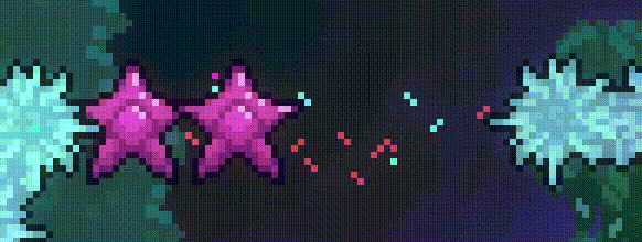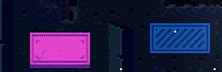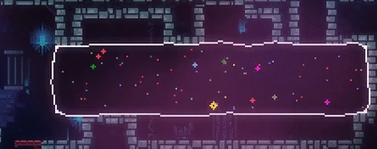 Large, black, sometimes-moving blocks with many-colored, purely cosmetic stars inside of them. Upon dashing into one of these blocks, the player will be transported in a straight line to the opposite side of the block, where they will then emerge. Emerging into a wall is deadly, but emerging through spikes is safe. When emerging from the left or right side, the player can jump for extra momentum (taught in 2-B) or cling to cancel momentum. These blocks can be found in Chapter 2 (where a special deactivated form of these blocks also appear), as well as in Chapter 7, the B and C-sides of Chapter 8, and Chapter 9. Names for this object include Dream Blocks, Space Blocks, Space Jam, Star Blocks, and Star Jam.