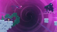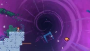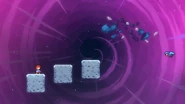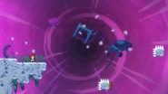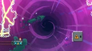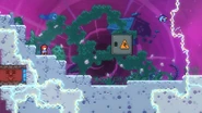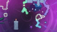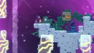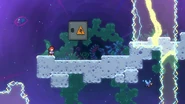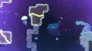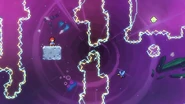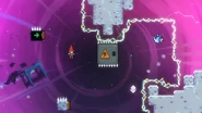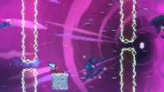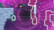 You'll need to race the angry platform to the right and utilize it to make it to the end of the room. This can be done by dashing into its right side then quickly getting on top of it and dashing up-right into the Bird, then from its fling doing three wavedashes off the three falling platforms above, allowing you to arrive on top of the angry platform as it continues right. Hold down to avoid the electricity above and you'll be taken safely up by a purple orb. Destroy the utility vault and continue right to complete the subchapter and arrive at the last one of the game.