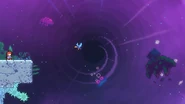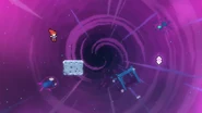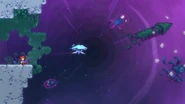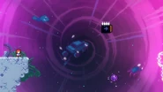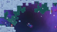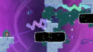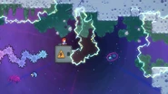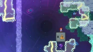 A fun secret possible in this room is that you can actually go back to the last room, which isn't normally possible in this subchapter. By dashing up and dashing into the pufferfish at the end of the last room, you can use the blast to get over the crystals in this room with one more dash and skip the first space block. However, in the main route, you can just jump and dash right into the space block and touch the purple orb, then dash straight right through the next space block. Do a space block jump to the right and dash into the Bird. Dash into the next space block and jump out of it to then dash right into another purple orb. After being flung up, quickly dash right into the Bird to avoid hitting the electricity. From the Bird's fling, you can either dash up-right over the electricity or dash straight down into the purple orb, allowing you to dash straight right slightly safer. Fall down to collect the first double dash crystals, then dash straight right and straight up into the next double dash crystals. From there, dash straight up and up-right, then fall to some more double dash crystals. Use both dashes to dash straight right and destroy the utility vault.