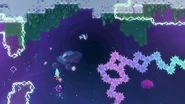 This room will also not feature the Bird and will instead be a refresher on the physics of the jellyfish. Do a wavedash to the right and then dash left or jump right and dash right to reach the spring below. From that bounce to the right, do a wall bounce off the nearby moon block and grab the jellyfish and take it right. Fall to the right for a bit and throw the jellyfish through the gap in the barriers. You'll fall into some double dash crystals and you'll be able to dash straight right and straight up to wall bounce and grab the jellyfish again and take it to the right, where it will be destroyed by a barrier and you'll then be able to jump and dash across the last few moon blocks to reach the end.