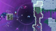 Jump and dash into the Bird, then you'll be able to do a large bounce off the pufferfish you arrive at from the fling, allowing you to knock the pufferfish down and to the right and allowing it to launch you off its right side. Alternatively, it's possible to dash up-right over the pufferfish instead of bouncing on it, then launching yourself to the right to perfectly fit between the gap in some crystals above and reach and dash into the purple orb just the same. You'll be launched into the Bird above, then it will fling you into an area with crystals all over so you need to dash back up-left, then from there you can fall to the pufferfish below and be launched to the right into the purple orb to the right. There will then be shifting electricity columns with gaps to pass through. Dash straight right when the time is right, then you'll fall into the next purple orb and be launched back up with a refreshed dash. Dash straight right through the next gap and fall into the double dash crystal below, using it to dash straight up and straight right to then fall into another purple orb. After this launch, dash into the Bird and you'll be flung to the right. Dash straight left into the utility vault's right side, then fall into the purple orb. The purple orb's launch will refresh your dash, allowing you to destroy the utility vault with the next one, then you'll get another dash which you can use to dash into the Bird and directly to the next room.