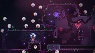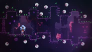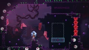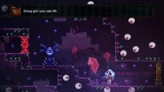 The player will start this subchapter by seeing Theo in his trapped state (in the same room it was possible to get a glimpse of in the previous subchapter) and walking up to him. After a conversation between him and Madeline, Theo's crystal is dropped on the ground. By holding the climb button while near the crystal, Madeline will pick it up. This severely limits her movement capabilities— she will walk slower, not be able to climb walls, and not be able to dash. By releasing the climb button, Madeline will throw the crystal forward and if the player holds down when releasing the button, the crystal is simply dropped in place. This throw can activate dash switches and knock away Seekers. Theo can die if he falls into a pit (which results in a death for the player), however Seekers can't damage him, nor can crystals as he will go right through them. He can also collect key tokens for the player when thrown or launched into them.